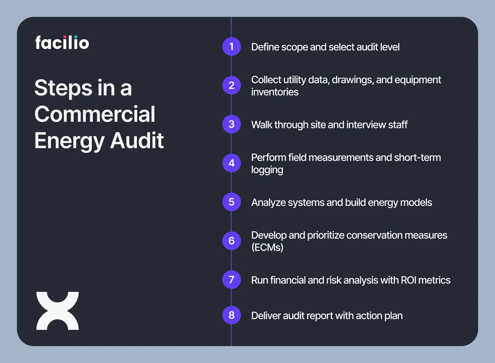 Here’s a 10-step framework for conducting a commercial energy audit effectively. This process is widely recognized in ASHRAE energy audit levels and ensures that findings can evolve into actionable commercial energy conservation initiatives: