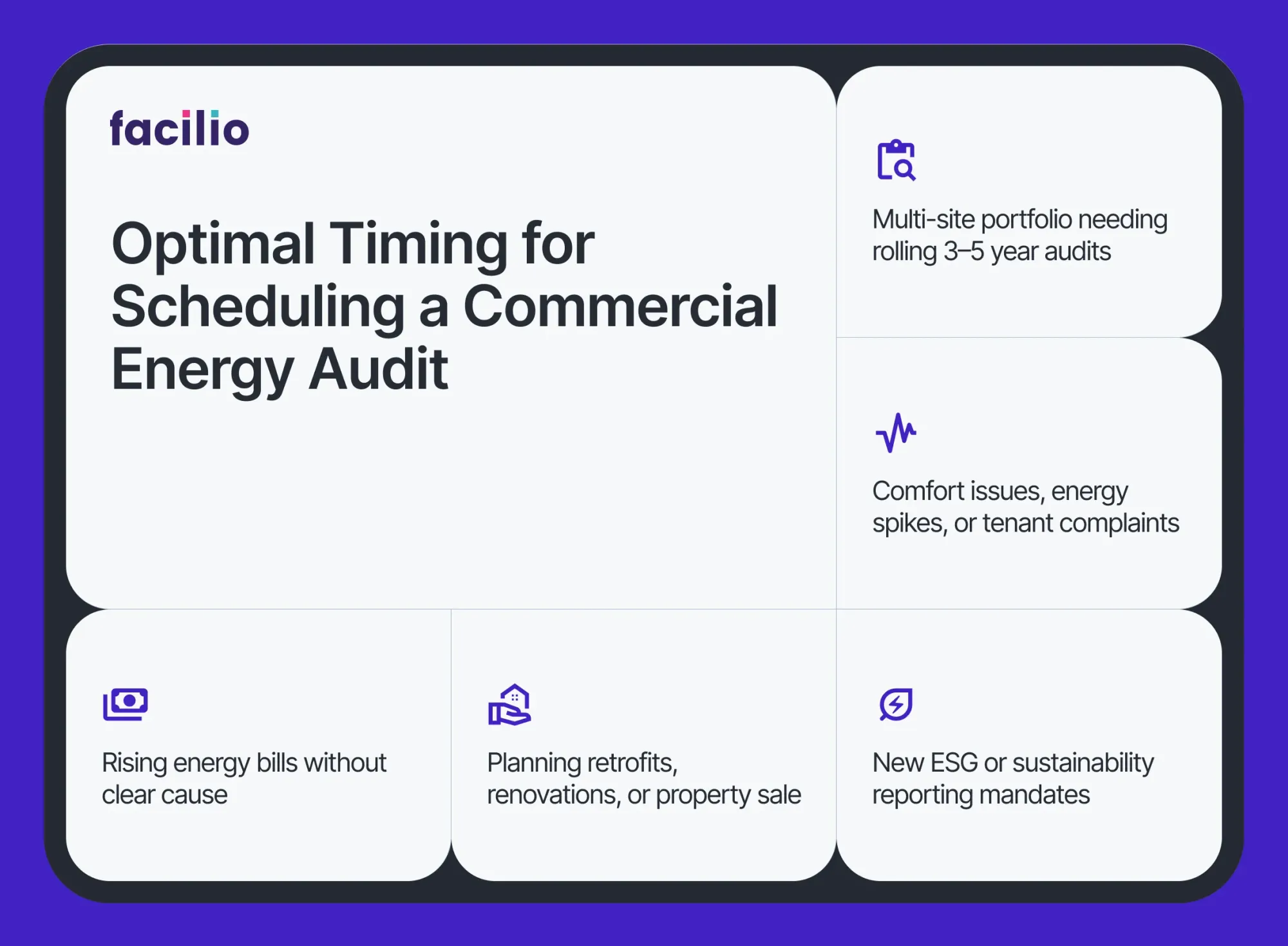 A small electricity audit for a single site may only take a day, while portfolio-wide facility energy performance audits involving detailed utility benchmarking can extend over multiple weeks.