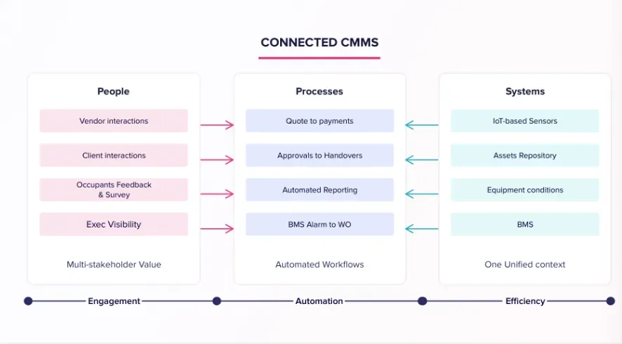 A connected CMMS facilitates smoother records, more effective communication, and accurate data management by bringing processes, stakeholders, and tools together in a single space.