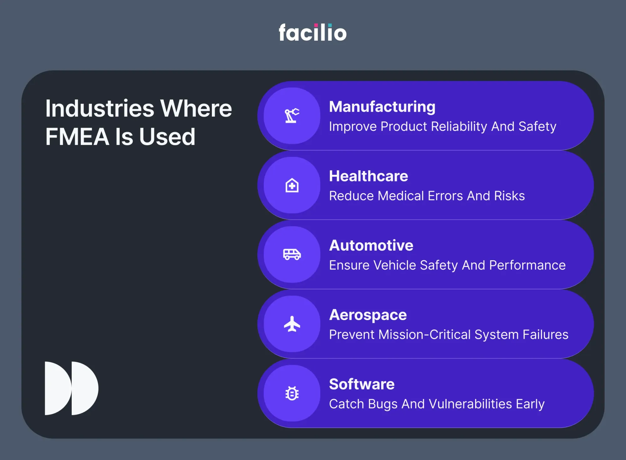 - Proactive: Catches risks before failures, unlike reactive “fix it when it breaks” processes. 80% of failures are preventable with techniques like FMEA (US Dept of Energy).