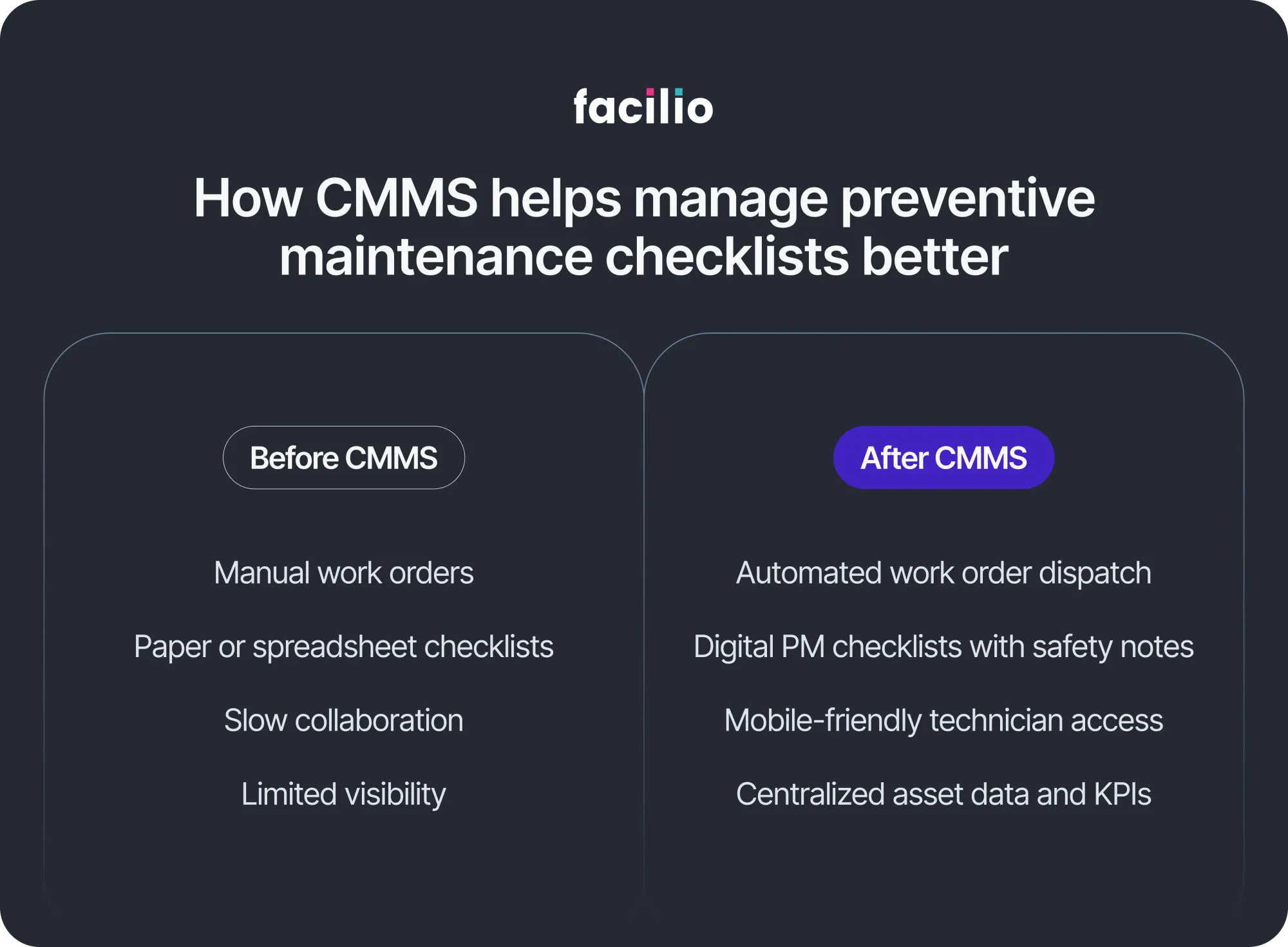 Checklists help streamline routine tasks to a large extent. More so when you use a CMMS software.