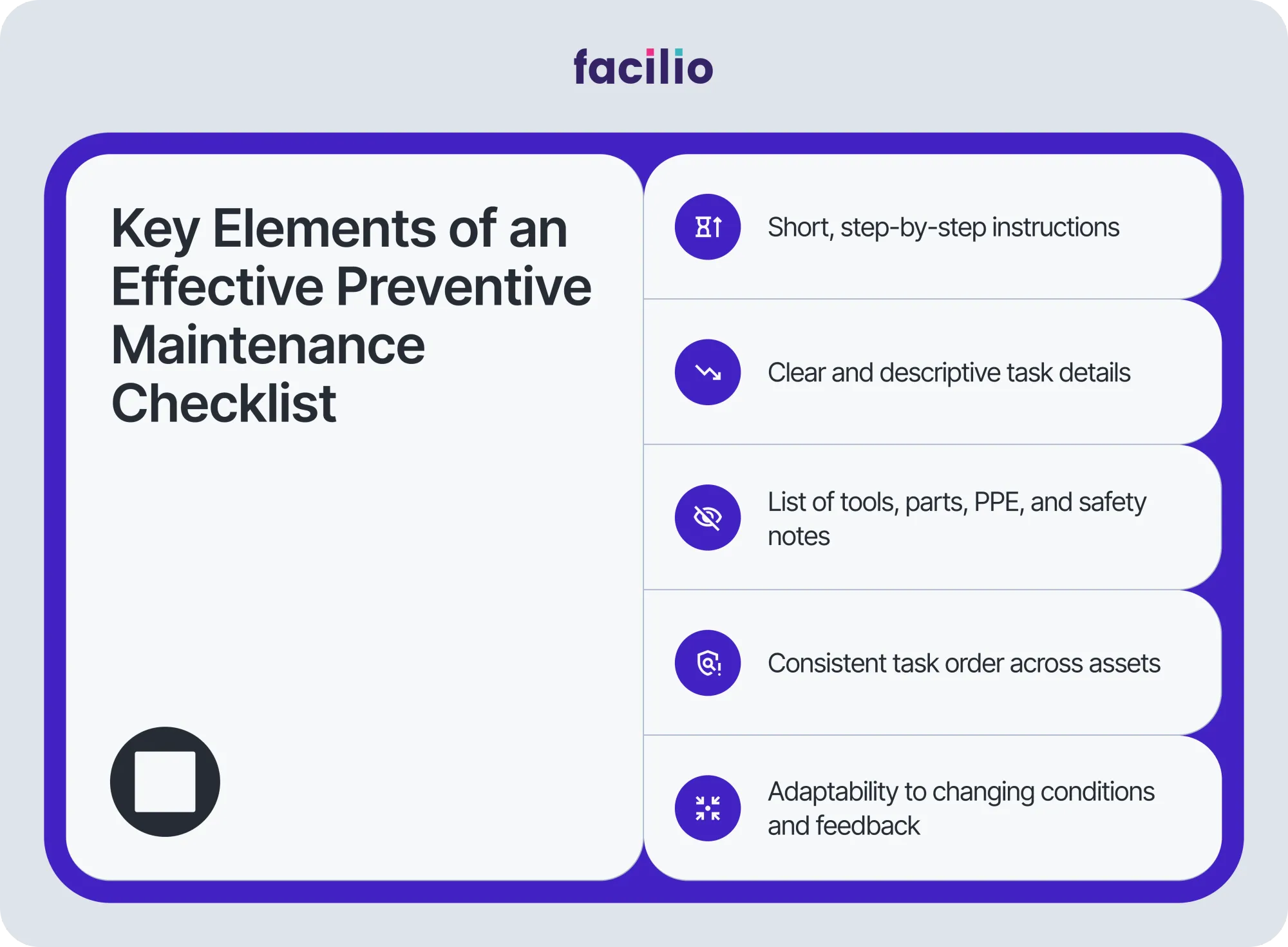 Summing up, a good PM checklist should contain the WHAT, WHY, and HOW for each task to help technicians understand what is to be done at a glance.