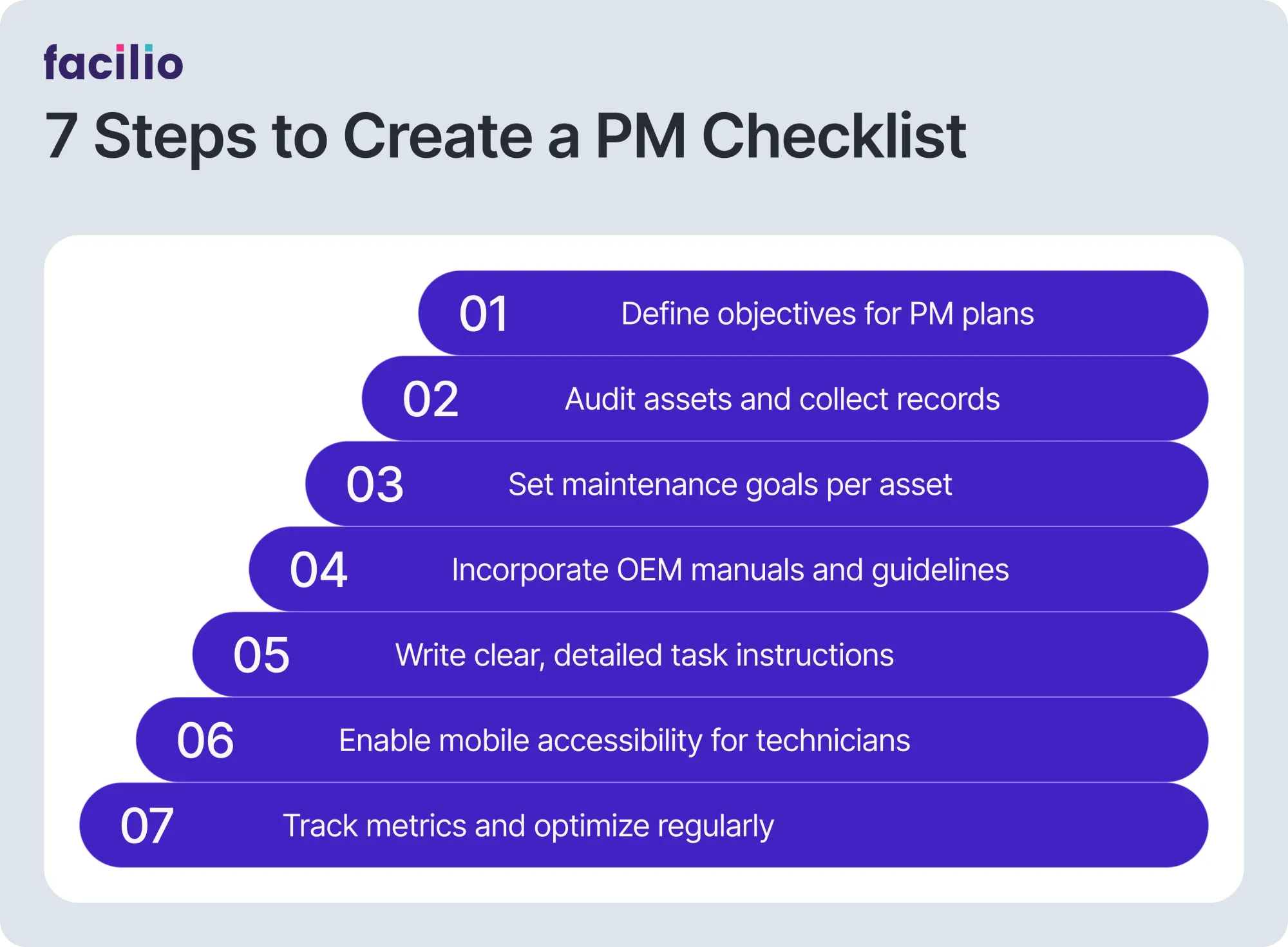 Preventive maintenance checklists include instructions from Original Equipment Manufacturer (OEM) guidelines and asset performance history to standardize preventive maintenance tasks for each equipment.