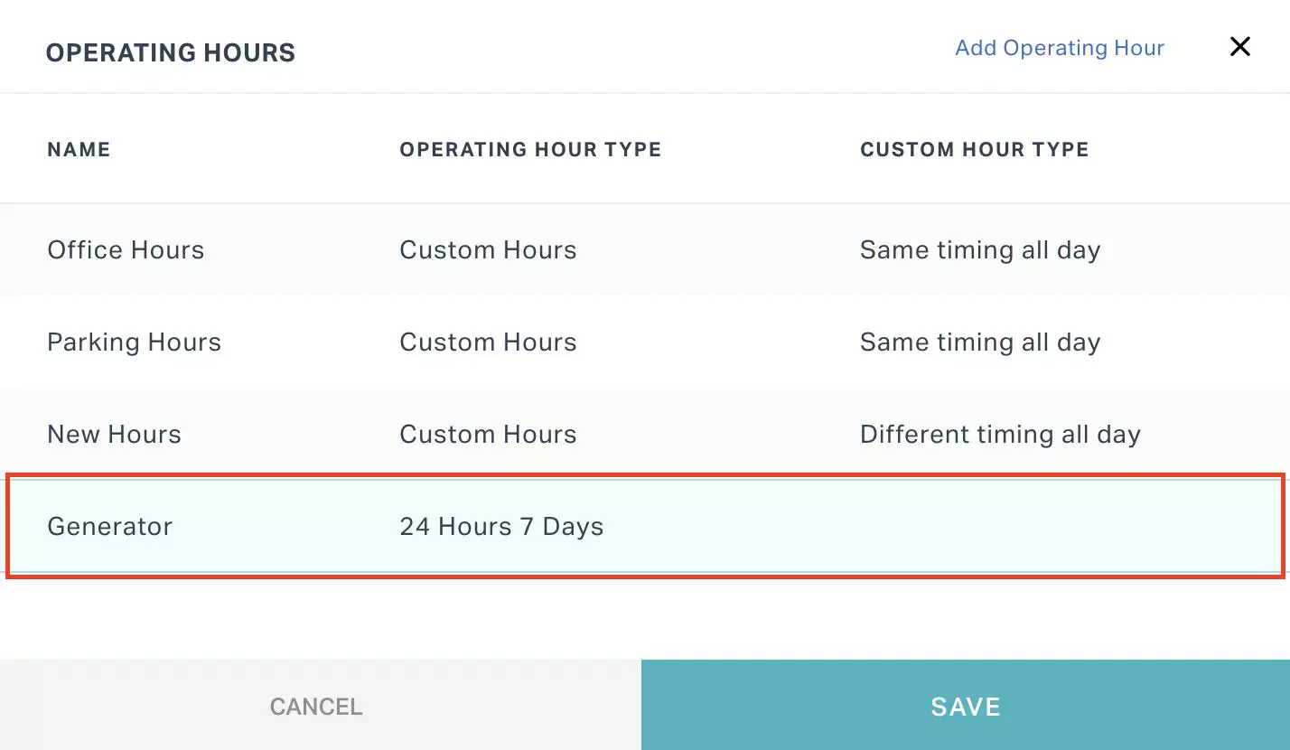 Note: You can use the Add Operating Hour link at the top right to directly configure the required operating hours. The operating hours created from any module will be added to the list of operating hours.Click SAVE. The operating hours are configured successfully for the asset and appear as shown below.