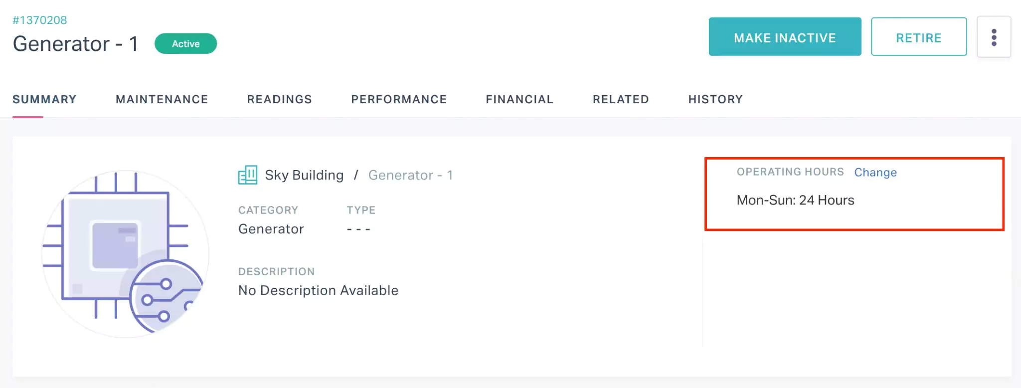 Note: You can use the Change link corresponding to OPERATING HOURS in the SUMMARY screen to update the operating hours assigned.