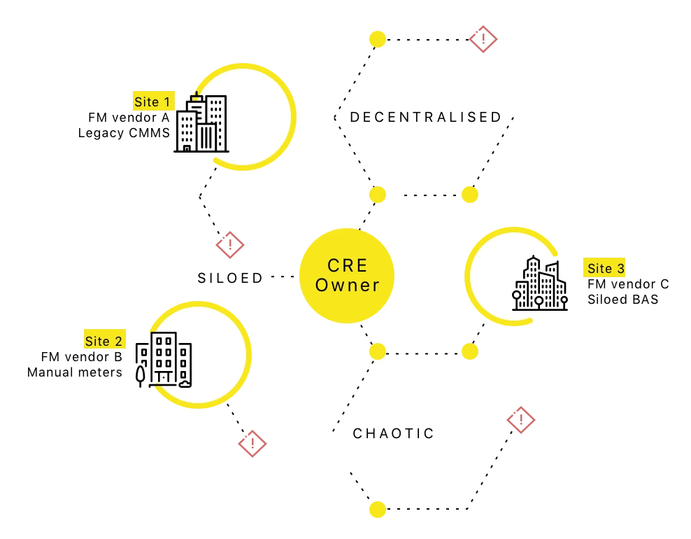 Buildings across a portfolio have different Building Automation Systems installed at the time of construction/acquisition managed by multiple FM vendors and disparate software systems. Each of these systems is rigid and self-contained with vendor-specific norms and protocols. Across the portfolio, buildings constitute huge vertical data silos from automation systems, legacy software, and manual entries combined, resulting in overall operational chaos.
